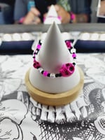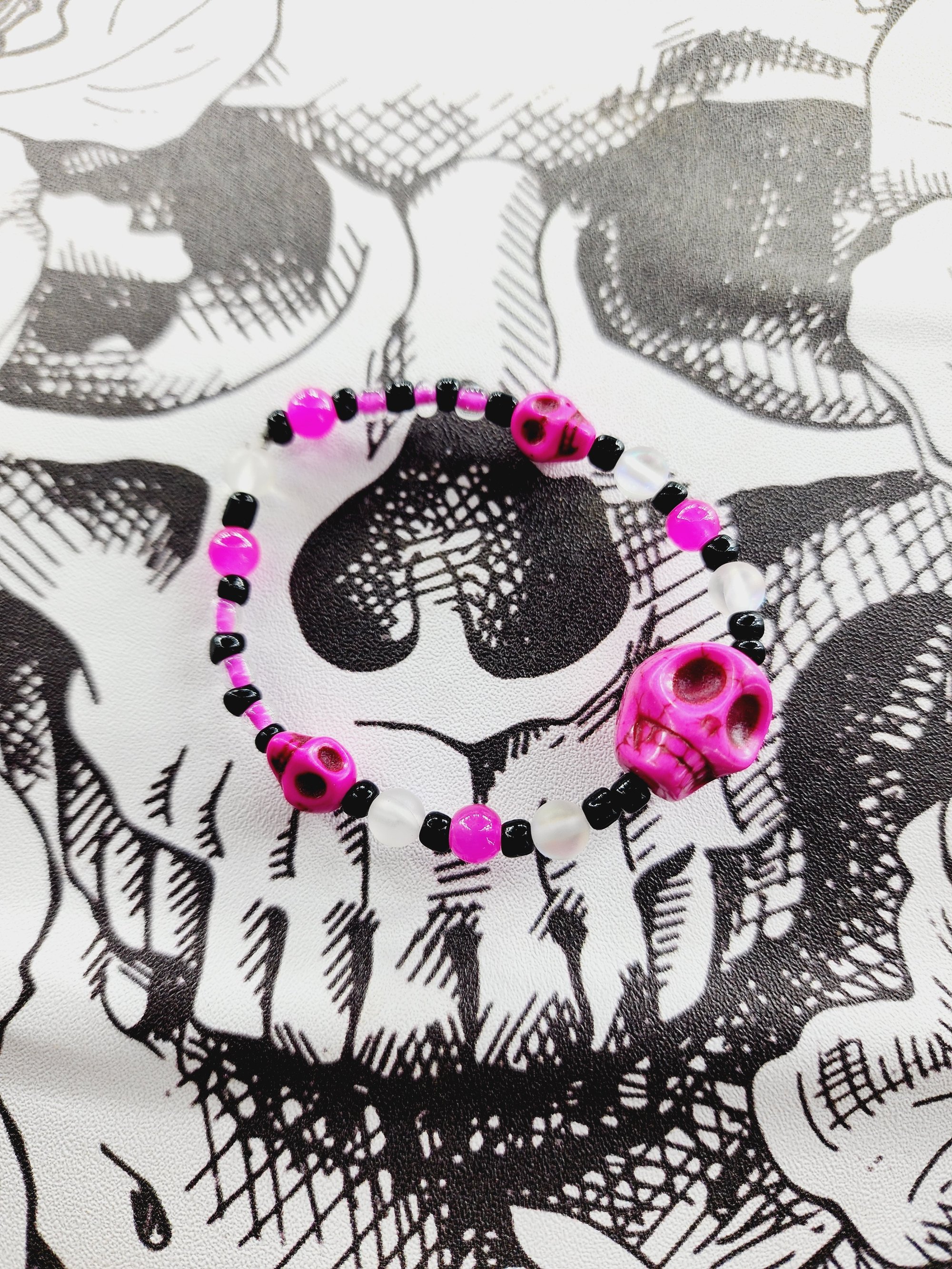 One large hot pink skull, opal moonstones, hot pink glass, black beads, and small hot pink skulls. Stretchy bracelet.