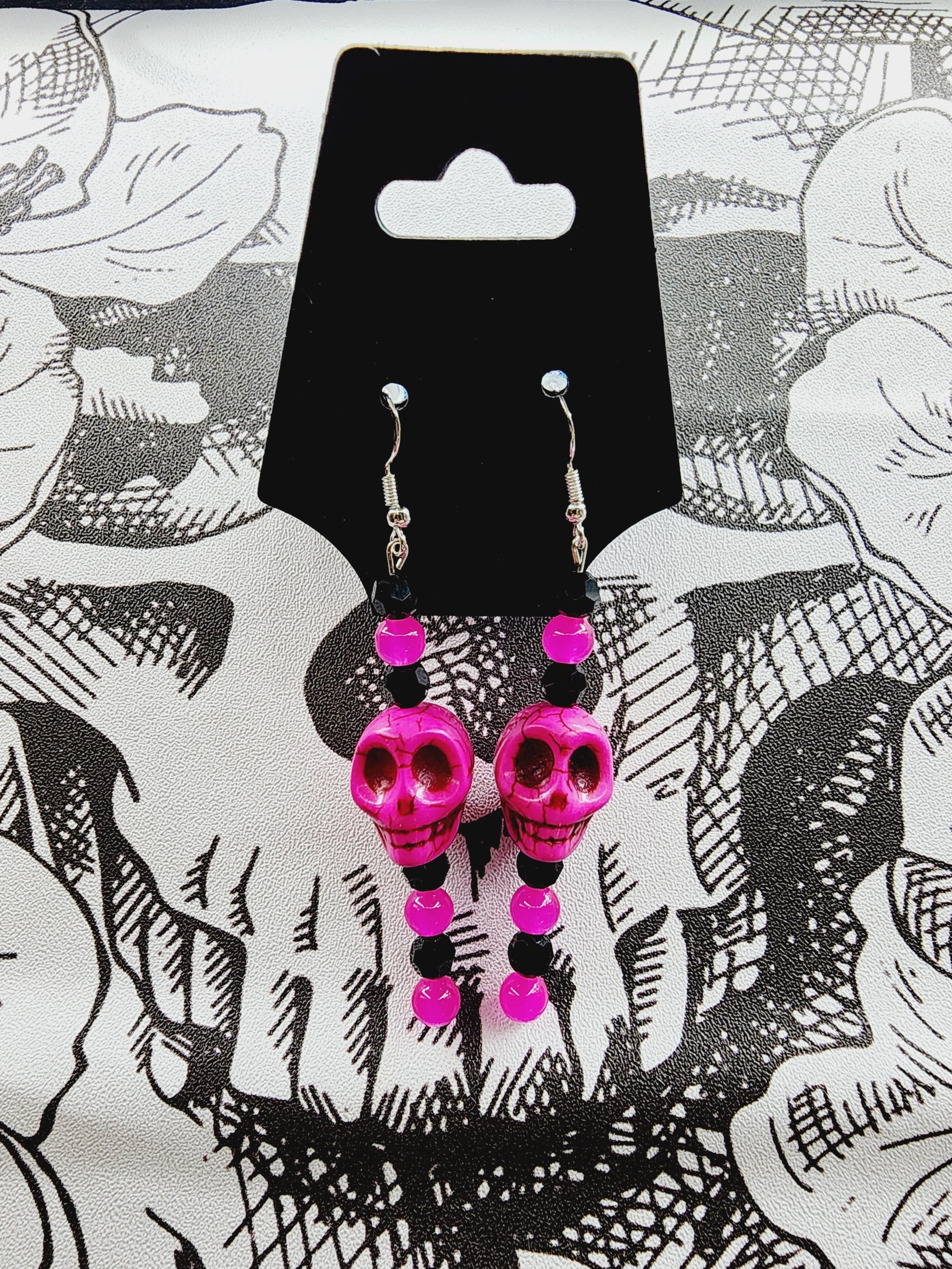 Large neon pink skull. Neon pink glass beads. Black faceted glass beads. Dangle earrings. All earrings are hypoallergenic and nickel free. ♡